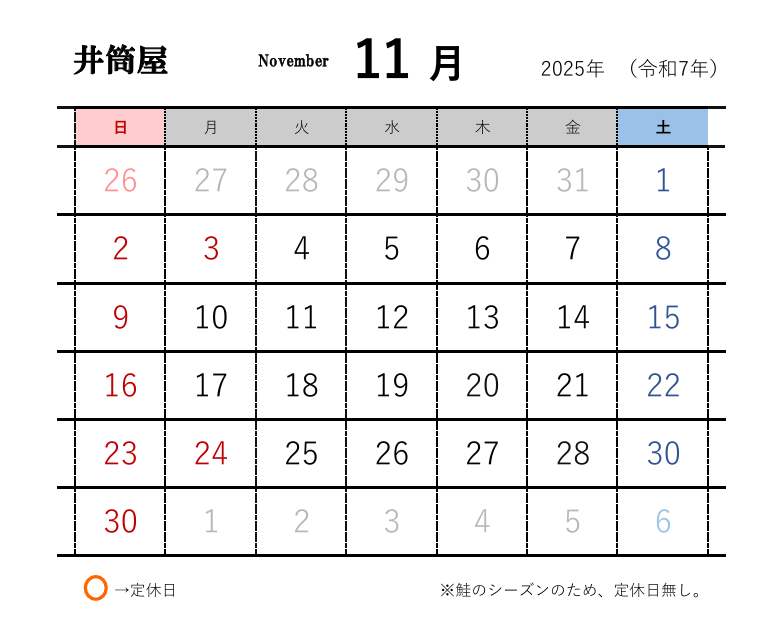千年鮭きっかわ 井筒屋、11月は鮭のシーズンのため休みなく営業いたします。